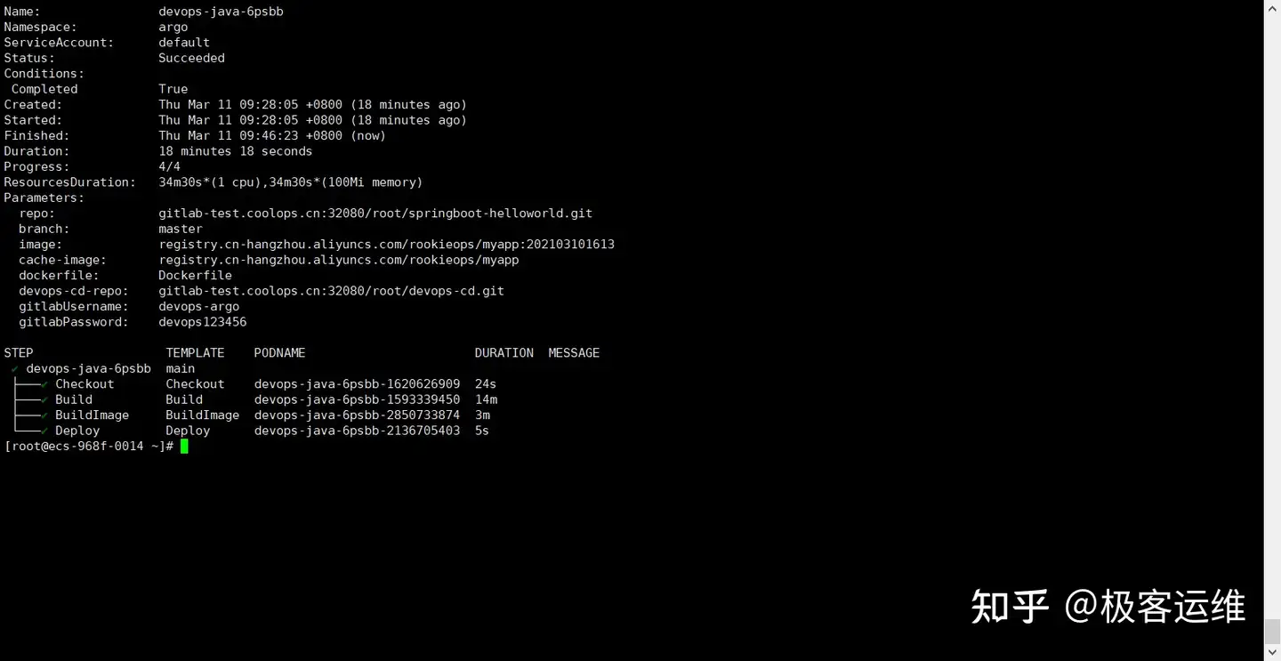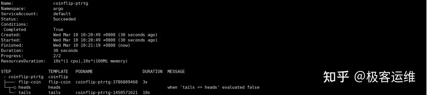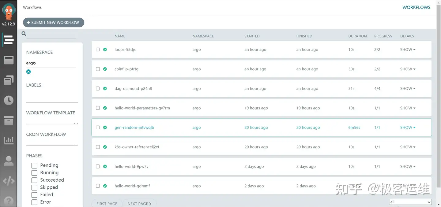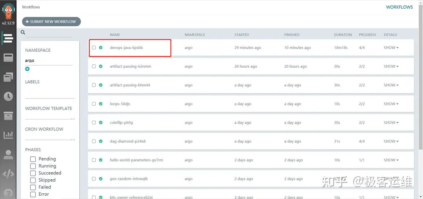 还可以通过 argo list 来查看状态,如下: