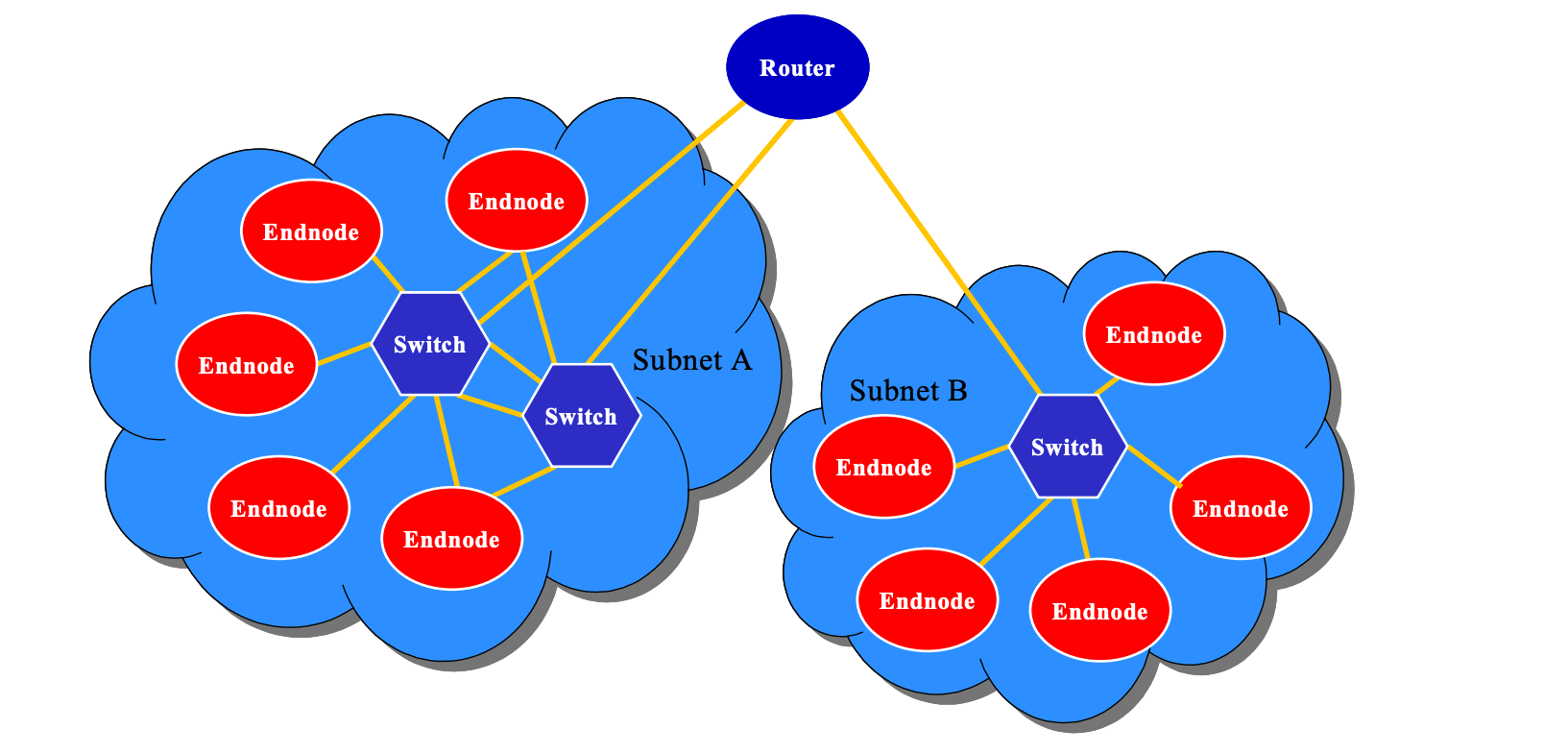 在一个子网中,必须有至少每个节点有一个 channel adapter,并且有一个 subnet manager 来管理 Link。