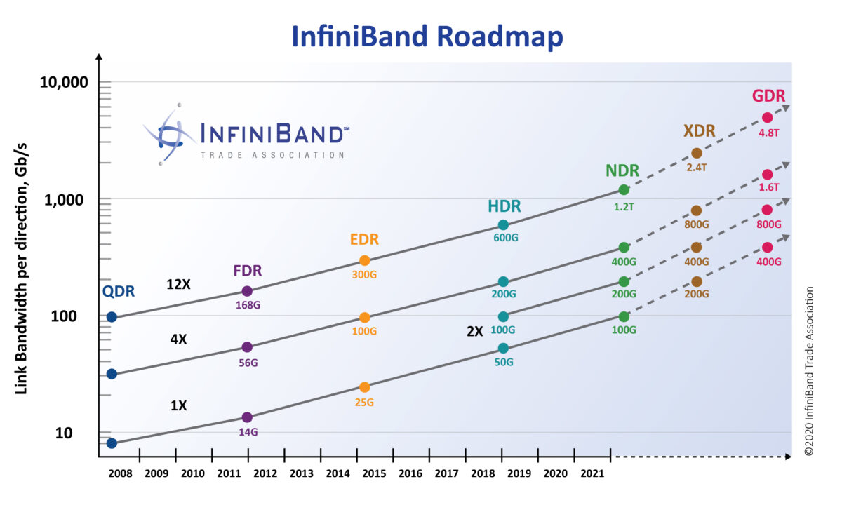 然而好景不长,2000 年互联网泡沫被戳破,人们对于是否要投资技术上如此跨越的技术产生犹豫。Intel 转而宣布要开发自己的 PCIe 架构,微软也停止了 IB 的开发。尽管如此,Sun 和 日立等公司仍然坚持对 InfiniBand 技术的研发,并由于其强大的性能优势逐渐在集群互联、存储系统、超级计算机内部互联等场景得到广泛应用,其软件协议栈也得到标准化,Linux 也添加了对于 Infiniband 的支持。进入 2010 年代,随着大数据和人工智能的爆发,InfiniBand 的应用场景从原来的超算等场景逐步扩散,得到了更加广泛的应用,InfiniBand 市场领导者 Mellanox 被 NVIDIA 收购,另一个主要玩家 QLogic 被 Intel 收购,Oracle 也开始制造自己的 InfiniBand 互联芯片和交换单元。到了 2020 年代,Mellanox 最新发布的 NDR 理论有效带宽已经可以达到 单端口 400 Gb/s,为了运行 400 Gb/s 的 HCA 可以使用 PCIe Gen5x16 或者 PCIe Gen4x32。
