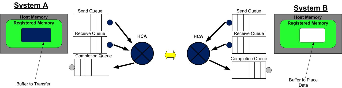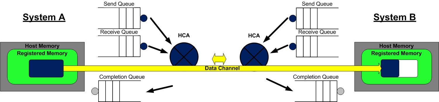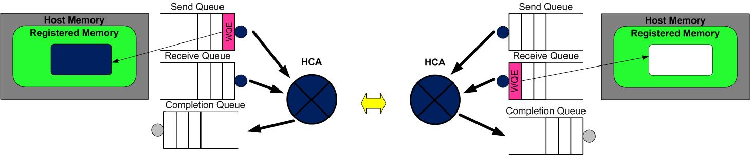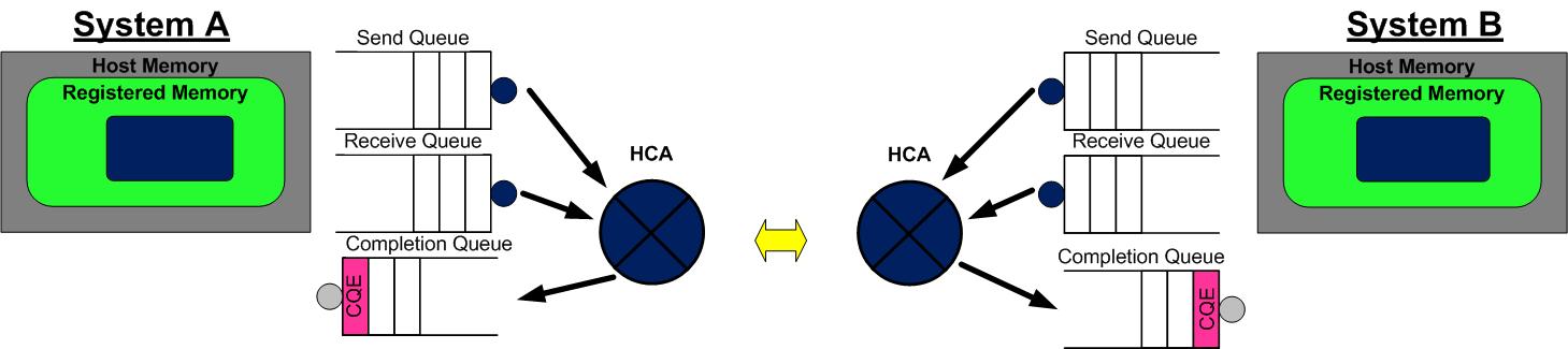 - A 和 B 分别向自己的 WQ 中注册 WQE,对于 A,WQ=SQ,WQE 描述指向一个等到被发送的数据;对于 B,WQ=RQ,WQE 描述指向一块用于存储数据的 Buffer