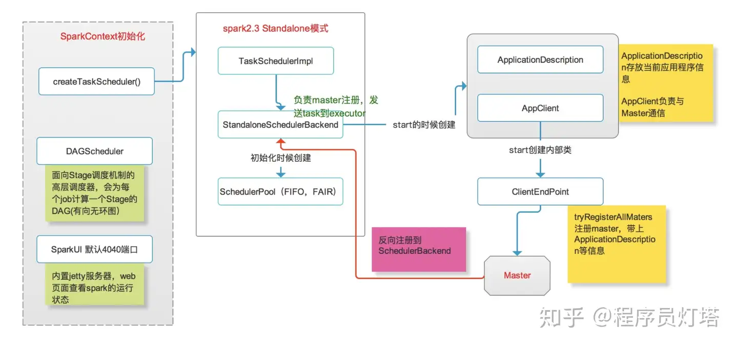 - 启动应用程序,在 SparkContext 启动过程中,先初始化 DAGScheduler 和 TaskSchedulerImpl 两个调度器, 同时初始化 SparkDeploySchedulerBackend,并在其内部启动 DriverEndpoint 和 ClientEndpoint