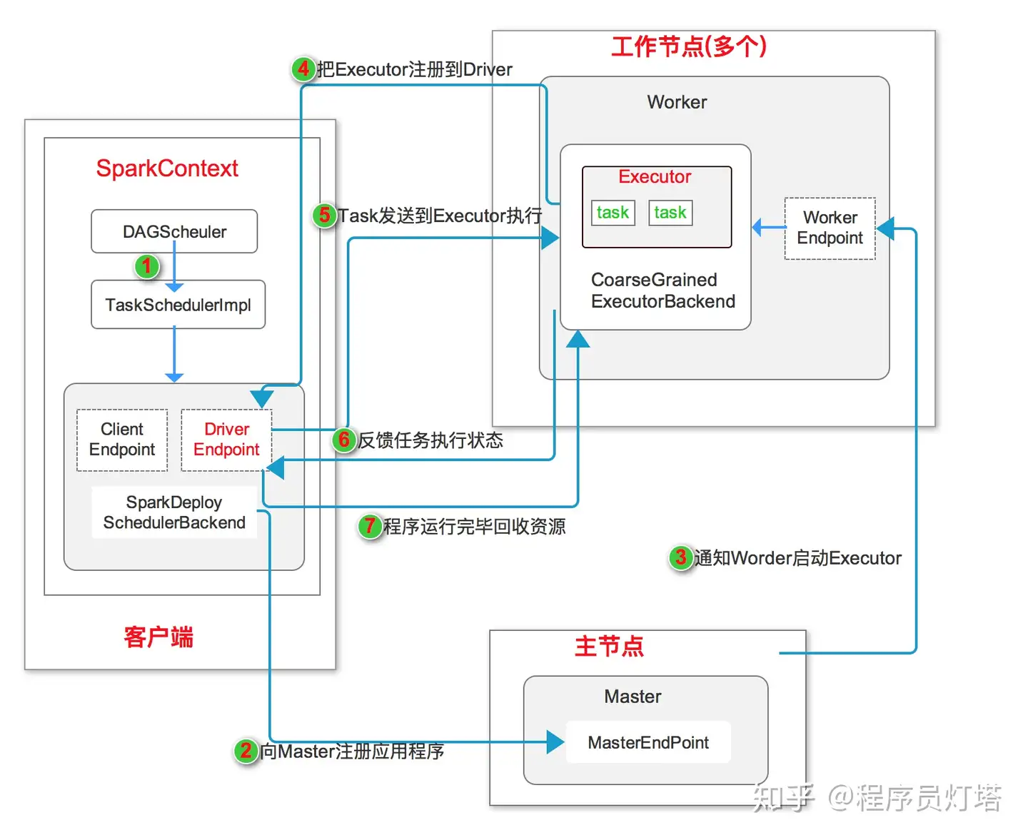 - Executor 创建完毕后发送消息到 Master 和 DriverEndpoint。在 SparkContext 创建成功后, 等待 Driver 端发过来的任务。