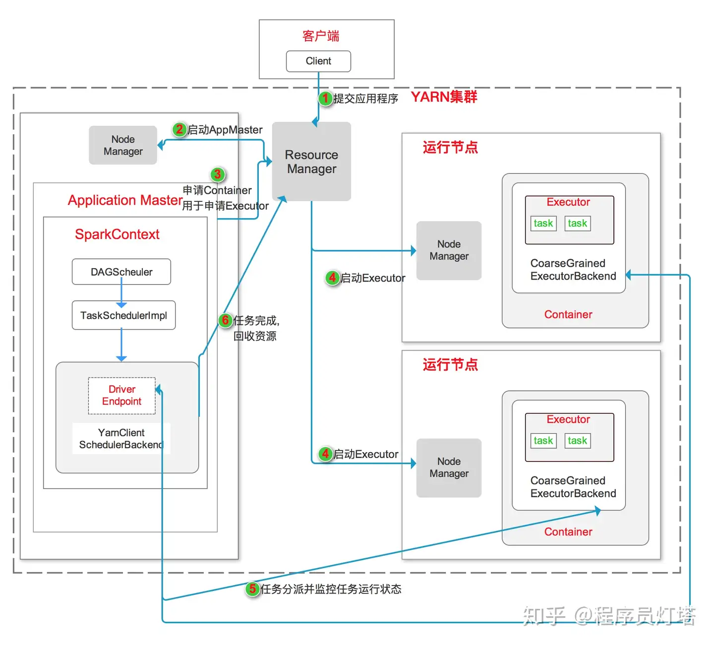 - 应用程序运行完成后,SparkContext 向 ResourceManager 申请注销并关闭。