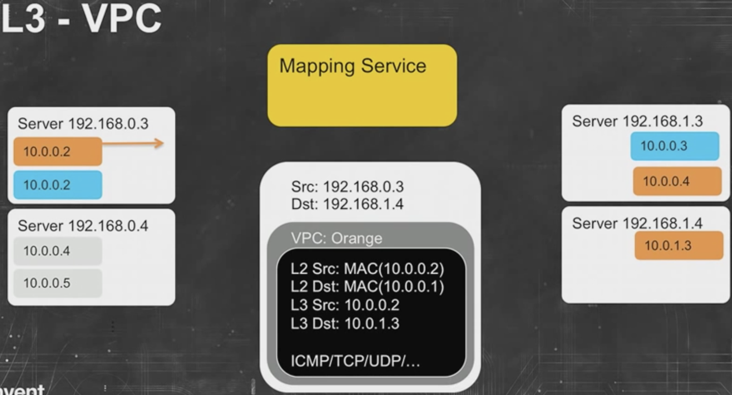 这里的 Mapping Service,与 SDN 控制器的作用可以说是一样的。SDN 控制器掌握了所有的网络信息,当需要进行二层,三层通信时,SDN 控制器会根据网络数据包下发 OpenFlow 流表,使得虚机之间直接通信。
