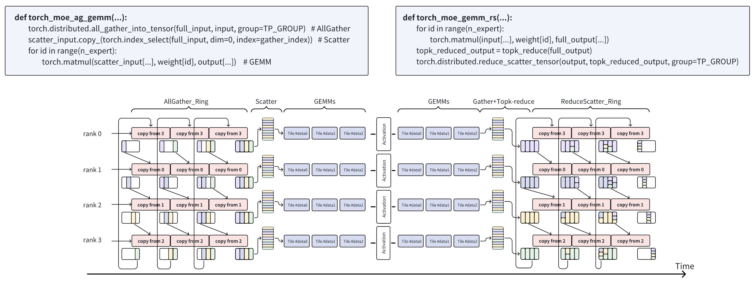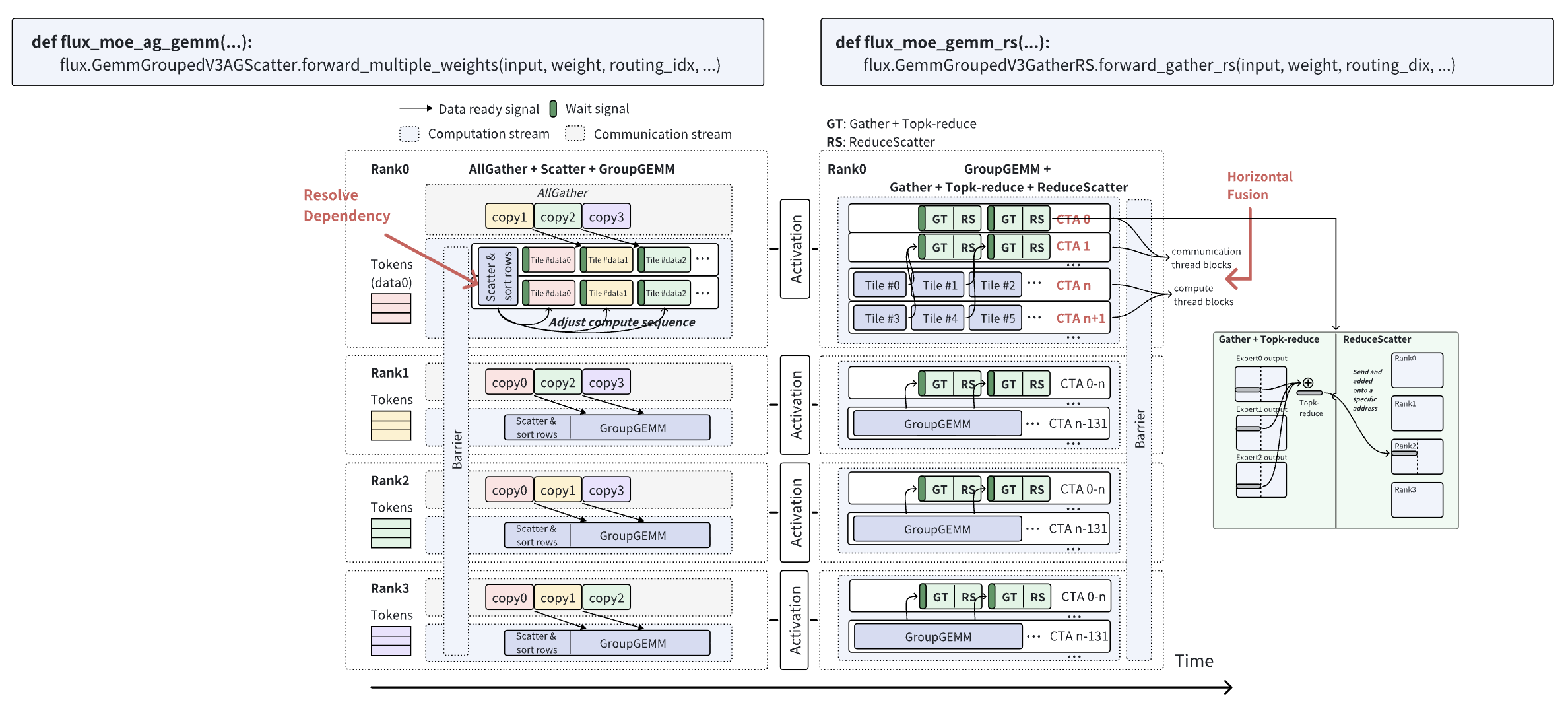 MoE 架构的稀疏特性导致计算和通信间的依赖动态且复杂。MoE 会动态地将 Token 分配给不同专家,而传统的粗粒度矩阵分块方式,会导致 GPU 频繁等待远程数据,从而造成计算资源闲置。