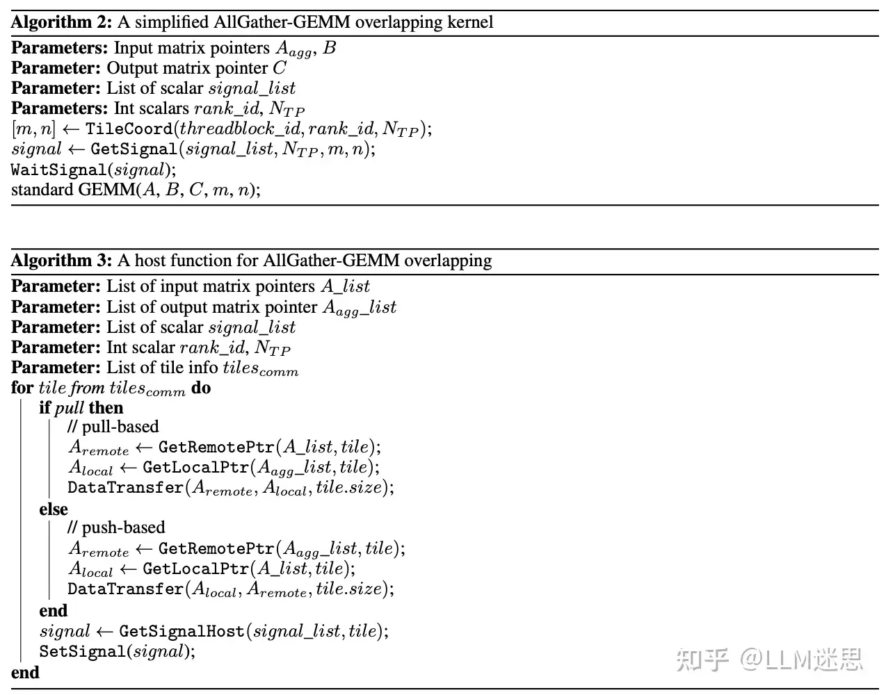 与 ReduceScatter 不同,AllGather 的实现采用首部融合方式,直接嵌入 GEMM Kernel 中。具体而言,AllGather 的信号检查功能被融合至 GEMM 内核的前序阶段。如下图 Algorithm 2 展示了融合 AllGather 后的 GEMM 伪代码,用于计算 C = Aagg × B,其中 Aagg 是通过 AllGather 聚合的输入矩阵 A 的缓冲区,B 为另一输入矩阵,C 为输出矩阵。