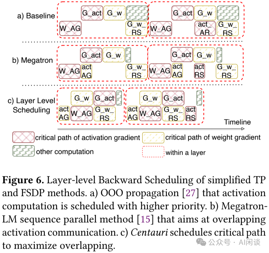 如下图 Figure 6a 和 6b,传统方法中,激活计算的输出作为前一 OP Backward 的输入,激活计算往往会赋予更高的调度优先级。然而,在混合并行配置中,这两部分的不同执行优先级会导致不同的时延。