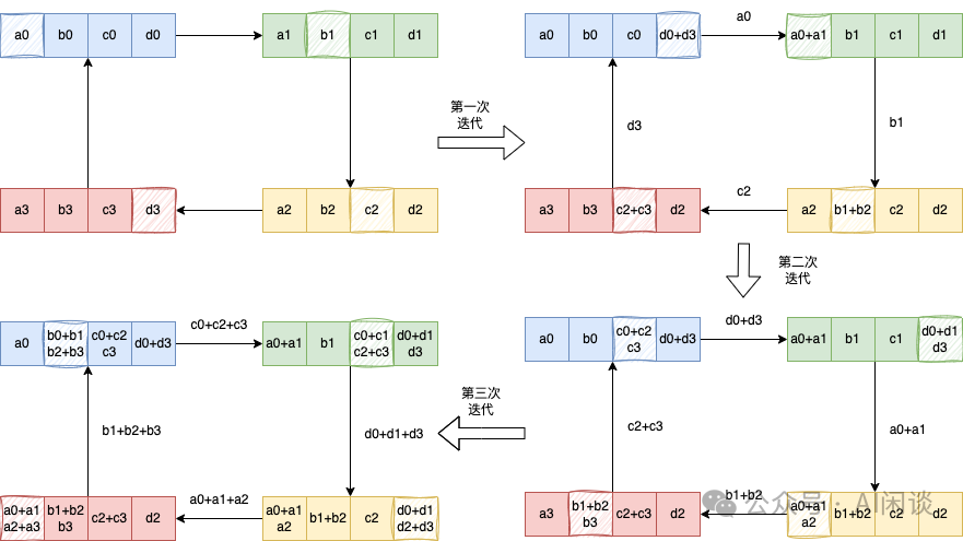 - 计算完成后,部分结果在迭代末尾被加到接收的累加结果分片,比如首轮迭代的结果 C10 与从设备 1 接收的结果分片 C1。