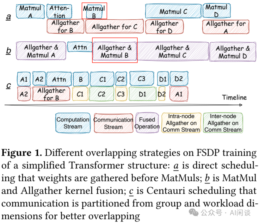 - 如下图 Figure 1b 所示,有些工作依赖复杂的编译器相关工作来对集合通信及邻近计算进行切分,并在算子层面生成融合 Kernel(比如上述的 Microsoft CoCoNet)。然而,细粒度的 Kernel 融合可能忽视了更广泛的 Graph 级别的调度计算(上述 Microsoft - CoCoNet 和 Google Intra-layer Overlapping via Kernel)。比如,1b 中的 Matmul B 反而比 1a 中的 Matmul B 慢。