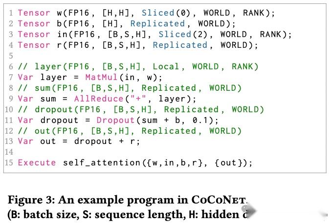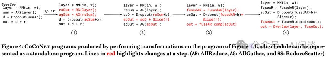 CoCoNet 提供了 4 种能够保持语义的转换方案,用于优化以 DSL 表示的程序。以下图 Figure 3 的代码为例,其主要是实现了 :矩阵乘法 + AllReduce + Dropout + Add。