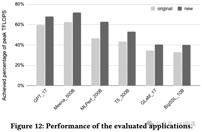 在 TPU v4 Pod 上评估不同规模的大模型(10B - 1T 参数量),所提方案可以实现 1.14x 到 1.38x 的吞吐提升。在 1024 TPU 集群中,500B 参数量语言模型训练可以实现 72% 的峰值 FLOPs 利用率。