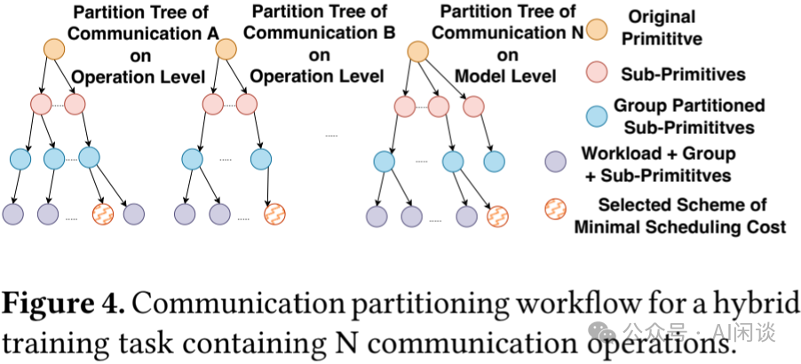 如下图 Figure 4 展示了通信切分的流程抽象,在混合训练中的每一个通信都会生成一个树形结构的切分空间,树中的每个叶节点都代表一种可行的切分方案。所选的方案旨在实现最小的调度成本,所有节点上的分区策略构成了一个庞大的切分方案森林,适用于混合训练任务。