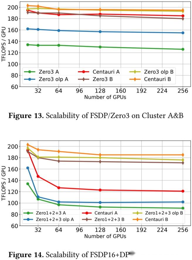 - 集群 A 代表带宽受限环境,Centauri 显著提升了 FSDP/Zero3 配置对应的吞吐量。并且所达到的吞吐量水平与高性能环境(集群 B)的表现相当,突出了 Centauri 对带宽变化的不敏感性。