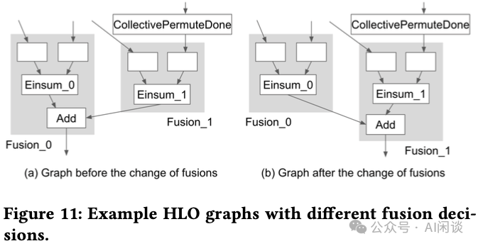 然而,基于默认启发式构建的某些融合操作可能损害 Overlap 性能。如下图 Figure 11 所示,11a 展示了一个简化的图结构,为默认的融合策略,其中的灰色方框为融合节点,白色方框表示一个或多个融合的高阶算子指令。其中两个 Einsum,Einsum_1 有一个异步的 CollectivePermuteDone 输入,由于 Einsum_0 与 CollectivePermuteDone 相互独立,预期其能与异步数据通信并行执行,以实现 Overlap。然而,与 Einsum_0 融合的加法操作在 Fusion_0 与 CollectivePermuteDone 之间引入了数据依赖,导致第三个节点顺序执行。为了避免这种不良融合,启发式策略调整为先将 Add 操作与具有异步 CollectivePermuteDone 操作的 Einsum 进行融合,新生成的图结构如图 11b 所示,数据通信得以成功与 Fusion_0 Overlap。