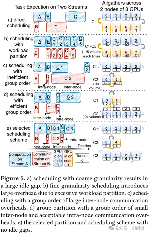 - 对于组切分,带宽感知调度以及节点间和节点内通信的恰当顺序至关重要,如下图 Figure 5c 和 5d 的比较所示,适当交错节点内和节点间调度方案,在下图 Figure 5e 中取得了最大的性能改进。因此,以适当的切分粒度正确交错执行节点内和节点间通信至关重要。