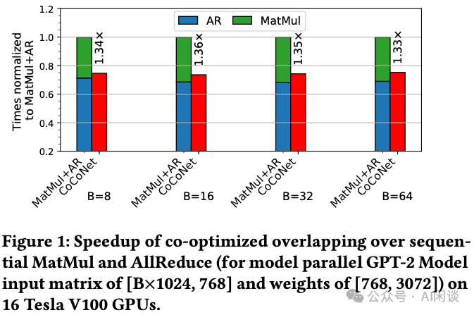 如下图 Figure 1 所示,MatMul 与 AllReduce 的细粒度 Overlap 执行可掩盖 80% 的 MatMul 执行时间,并带来 1.36x 的加速效果。