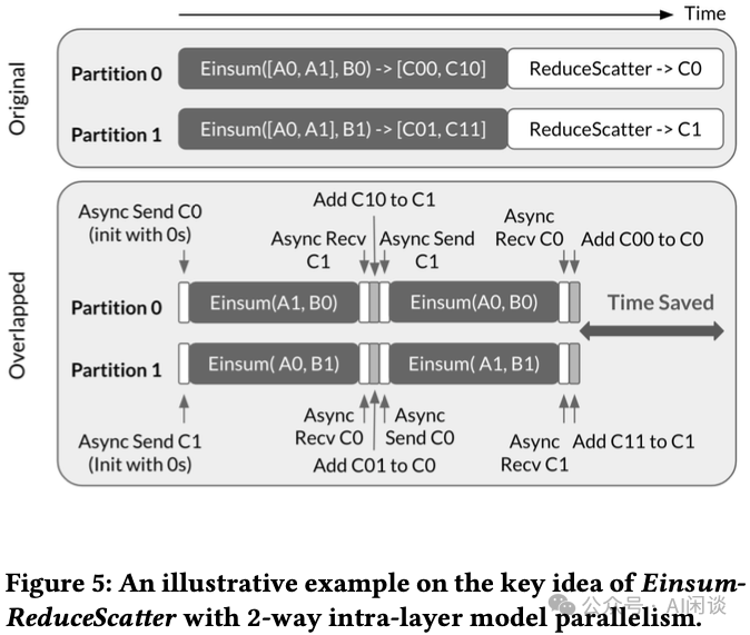 - %28b%29:将数据拆分为多个 Chunk,并使用 ReduceScatter + AllGather 代替 AllReduce,即可实现一定的 Overlap,并减少冗余数据传输。