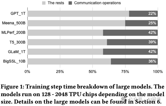 如下图 Figure 1 所示,不同规模模型在 128-2048 TPU 上训练,通信开销可达 22%-42%: