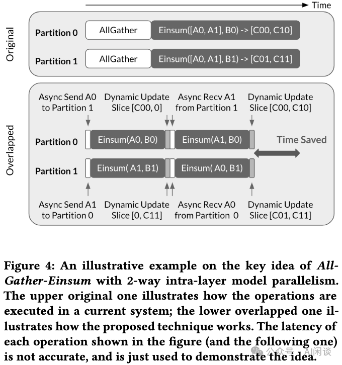 - 每轮迭代开始时,各设备异步发送累加结果分片到另一个设备(例如,首轮迭代中设备 0 发送切片 C0 到设备 C1),并与此同时启动部分 Einsum 计算。
