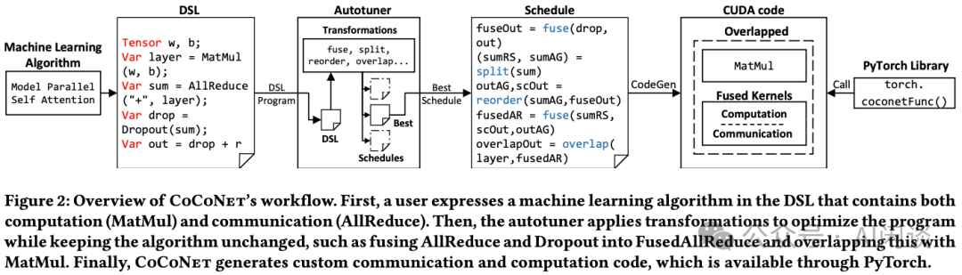 CoCoNet1 可能是最早提出异步张量并行(Async Tensor Parallelism)的工作,作者提供了一种通用 Kernel 融合的范式,能够自动生成集合通信与常见计算操作(如 GEMM 和卷积)之间的融合 Kernel。具体来说,CoCoNet 包含: