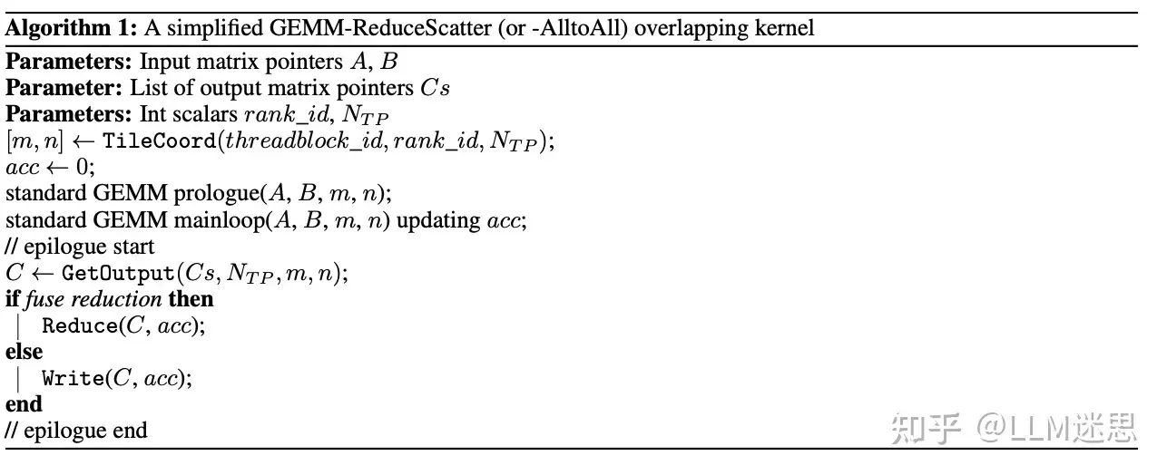 值得一提的是,在 AllGather 方法中,作者将通信的等待逻辑融合到 GEMM Kernel 中,而非整个通信操作。因此,AllGather 并不必然依赖 P2P 通信。同时,在 AllGather 中,通信的分块策略(tilescomm)与 GEMM 计算的分块策略相互解耦。这一设计提供了一种灵活的权衡方式,能够在不损害 GEMM 效率的前提下,选择 Overlap 机会与通信效率之间的最佳平衡。