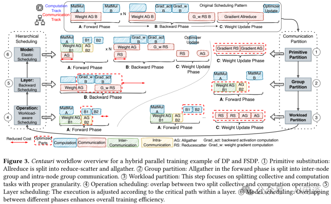 如下图 Figure 3 所示,Centauri 的工作流程包含两个核心环节:通信切分与层次调度。以 DP 与 FSDP 混合并行训练为例: