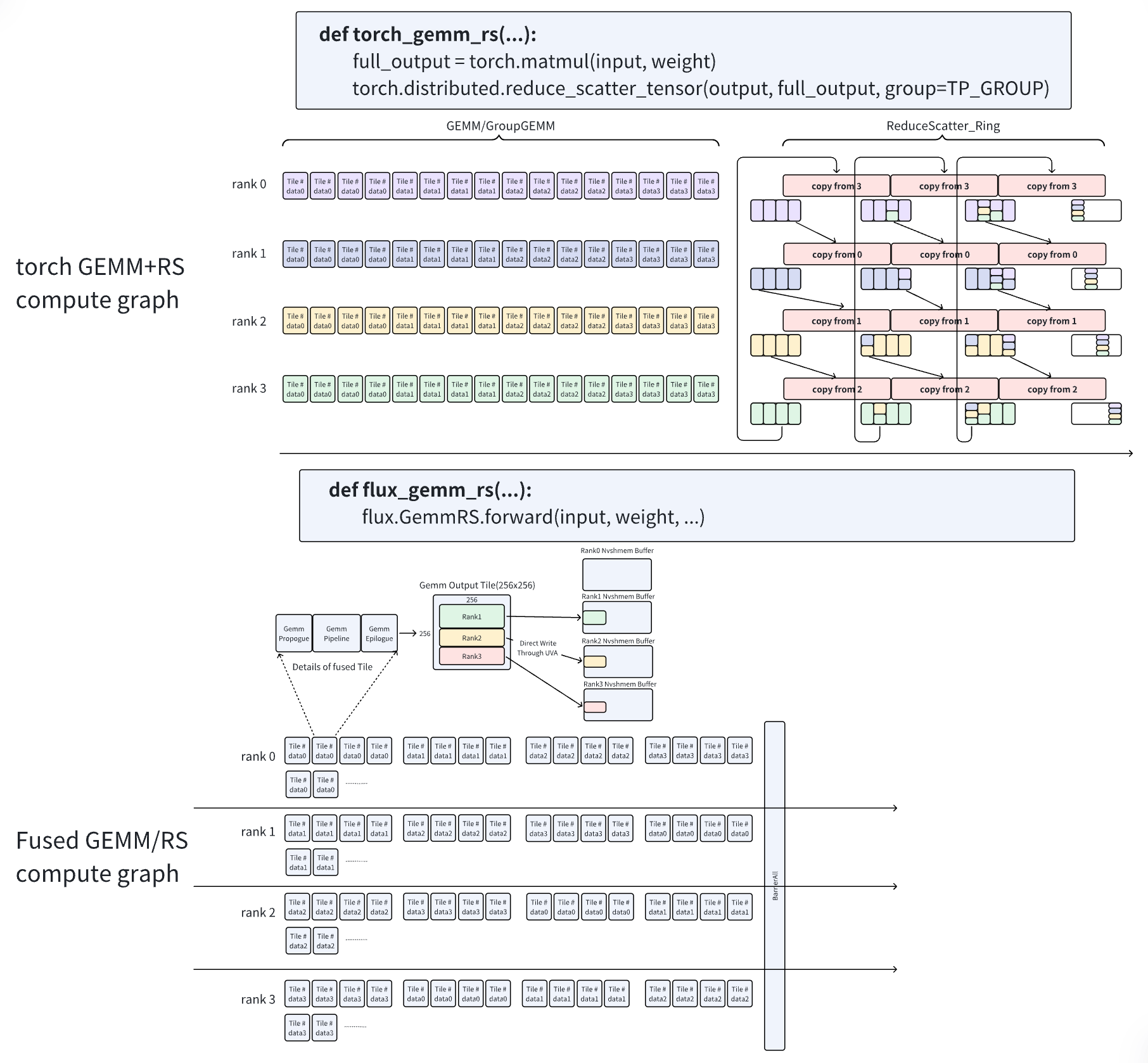 - ReduceScatter Overlap 通常需要在 GEMM 操作之间执行额外的计算操作(如上图中的加法操作),这会产生数据依赖,阻止通过 GPU 多路复用并发执行多个 GEMM 内核。虽然可以进一步将加法操作与通信融合,但仍阻止多个 GEMM 内核的并发执行。