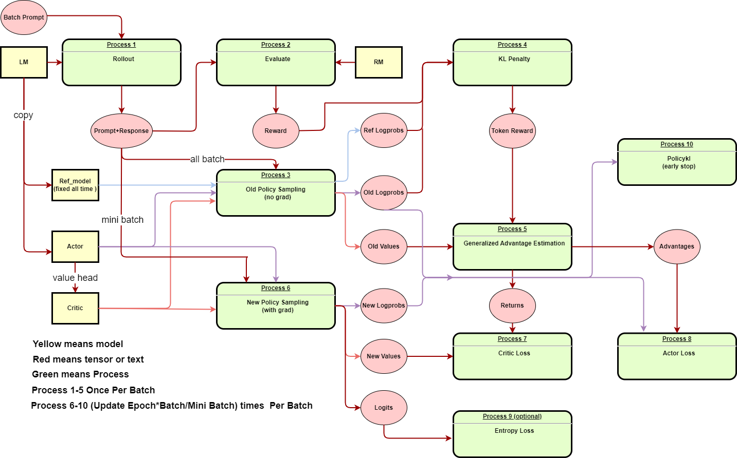 在 generation 阶段给定 prompt 生成 response 之后,接下来对于这个 batch 的数据,需要经过 Old Policy Sampling 计算得到 old_log_prob,对应于上图中的 Process 3。