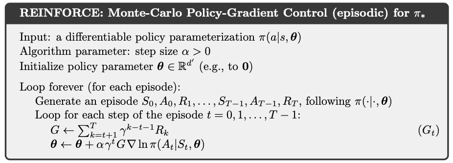 Policy Gradient 算法的核心思想是通过优化策略使得优化目标 $J (\theta)$ 累积期望激励最大。 $$ \begin{align*} \theta_{t+1} &= \theta_t + \alpha \nabla_\theta J(\pi_\theta) \ &= \theta_t + \alpha \mathbb{E}{s_t ~ d^{\pi}(s), a_t~\pi{\theta}(s_t)} \left[Q_\pi(s_t, a_t) \nabla_{\theta} \log \pi_\theta(a_t|s_t) \right] \ \end{align*} $$ 因为真实的梯度并不知道,我们用一个随机梯度来预测它: $$ \begin{align*} \theta_{t+1} &= \theta_t + \alpha \left[\hat{Q}(s_t, a_t) \nabla_{\theta} \log \pi_\theta(a_t|s_t) \right] \ \end{align*} $$